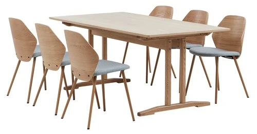 Table : MDF, contreplaqué chêne. Pieds : chêne massif. Vernis. Incl. 2 rallonges. l95 x L180/270 x H75 cm. Chaise : structure : contreplaqué, placage bouleau/chêne. Revêtement : polyester. Garnissage : mousse polyuréthane (25 kg/m³). Pieds : plastique, métal. Vernis transparent. l47 x H81 x P54 cm