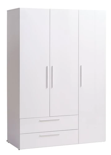 En panneau de particules mélaminé. 3 portes soft-close, 2 tiroirs soft-close. Intérieur de garde-robe : 5 étagères et 1 tringle à vêtements. l144 x H208 x P62 cm