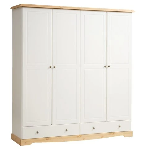 Pin massif et MDF (panneau de fibres moyenne densité). Intérieur de garde-robe : 4 étagères et 1 tringle à vêtements. l203 x H216 x P58 cm