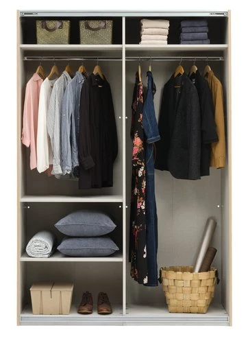 En panneaux de particules mélaminé. 2 portes coulissantes soft-close. Intérieur : 2 tringles à vêtements, 4 étagères. l150 x H222 x P68 cm
