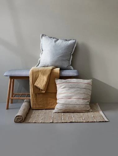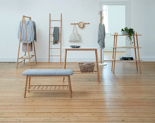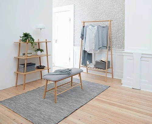 Structure : MDF. Garnissage : mousse polyuréthane (18 kg/m³). Revêtement : 100% polyester. Pieds : bambou. Vernis. l90 x H45 x P34 cm