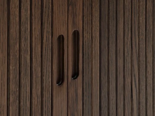 Chêne massif, placage chêne et placage décoratif. Avec portes coulissantes tambours. l160 x H80 x P40 cm