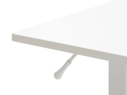 En panneau de particules mélaminé et plastique ABS. Pieds : aluminium, acier, plastique ABS. Bureau réglable en hauteur, sans fil (vérin à gaz). Avec roulettes. l41 x L70 x H72-106 cm