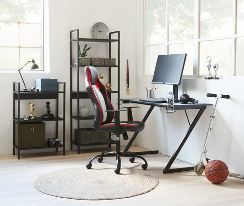 Cadre et piètement : acier. Partie supérieure : MDF mélaminé. Avec porte-gobelet, support casque. l60 x L120 x H74 cm