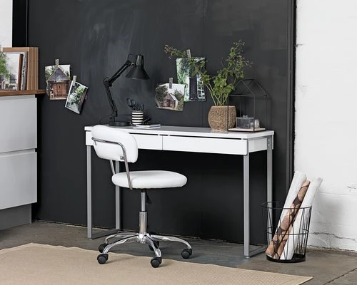 Face avant, partie supĂ©rieure, cĂ´tĂ©s : MDF, plastique ABS. Surface : polyurĂ©thane. Pieds : mĂ©tal. Vernis. 2 tiroirs avec glissières d’extension complète. l40 x L120 x H77 cm