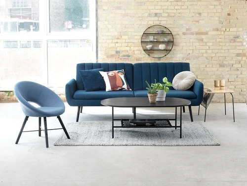 Structure : contreplaqué. Piètement : hévéa vernis noir. Rembourrage : 100% polyuréthane (28 kg/m³). Revêtement : 100% polyester (270 g/m²). 3 places. Le canapé se convertit facilement en couchage 114×190 cm, l210 x H85 x P100 cm