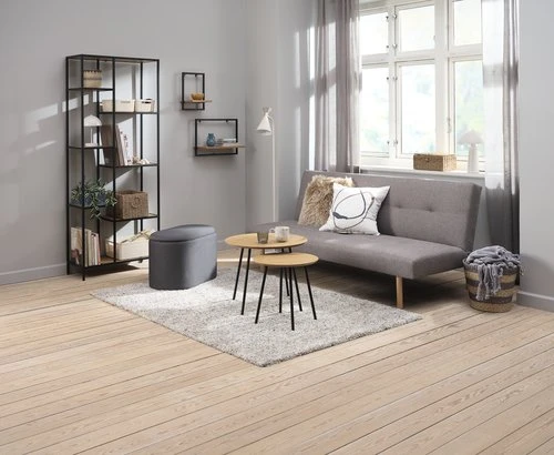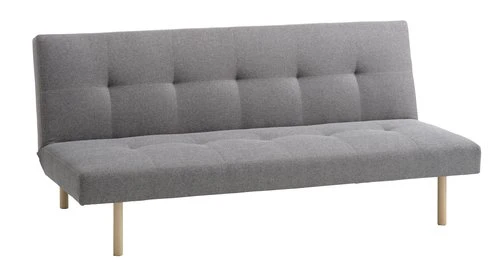 En contreplaqué, eucalyptus massif, polypropylène, acier. Garnissage : mousse polyuréthane (10/45 kg/m³). Revêtement : polyester. Pieds : bois de caoutchouc massif. 2 places. Couchage : 108×80 cm. l180 x H82 x P92 cm