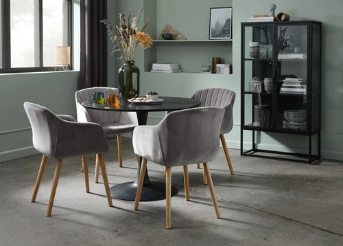 En contreplaqué, acier. Garnissage : mousse polyuréthane (22/25 kg/m³). Revêtement : polyester. Pieds : bois de caoutchouc massif. l59 x H82 x P59 cm