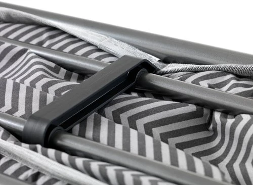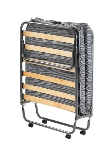 Cadre en acier. Lattes en bouleau massif. Garnissage matelas : 7cm d’épaisseur, mousse polyuréthane (16 kg/m³). Revêtement : polyester. Pliable. l80 x L190 x H33 cm