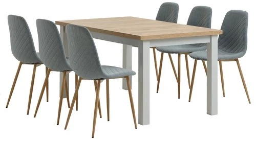 Table : plateau : panneau de particules mĂ©laminĂ©. Pieds : HDF, pin et Ă©picĂ©a massifs. Incl. 1 rallonge Ă ranger sous le plateau de la table. l90 x L150/193 x H75 cm. Chaise : structure : contreplaquĂ©. Garnissage : mousse polyurĂ©thane (20 kg/mÂł). RevĂȘtement : polyester. PiĂštement : acier. l44 x H87 x P53 cm