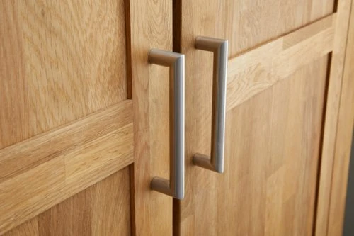 Chêne massif et placage chêne. Portes soft-close. Tiroirs soft-close. Intérieur la garde-robe : 6 étagères et 1 tringle à vêtements. l120 x H200 x P60 cm