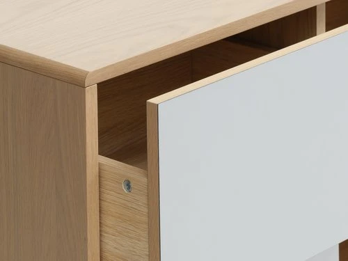 Face avant tiroirs, portes : panneau de particules, stratifié haute pression, chêne massif. Cadre, partie supérieure, étagère : panneau de particules, placage chêne, chêne massif. Côtés : panneau de particules mélaminé, placage chêne. Pieds : chêne massif. Vernis. l150 x H75 x P42 cm