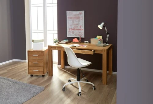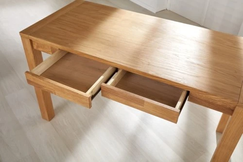 Chêne massif et placage chêne. Tiroirs avec glissières d’extension complète. l60 x L130 x H75 cm