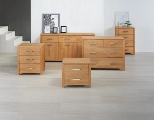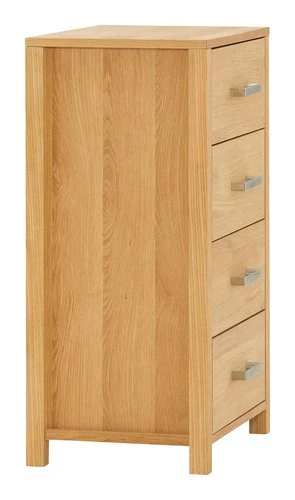 Bois massif et placage chêne. Tiroirs avec glissières d’extension complète. l55 x H91 x P40 cm
