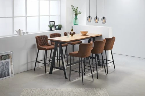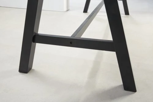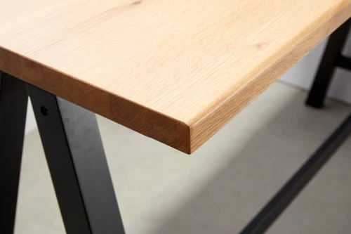 Plateau : panneau de particules plaqué chêne, finition vernie. Piètement : mélèze massif recouvert MDF, finition vernie noir. l71 x L183 x H105 cm