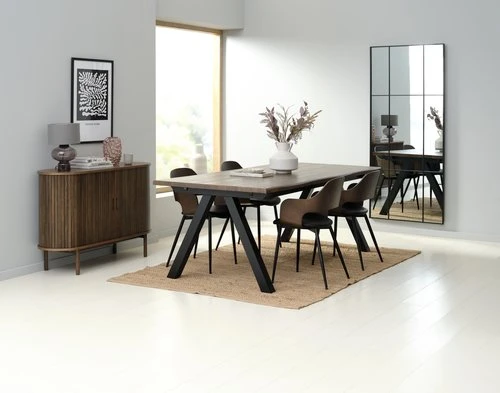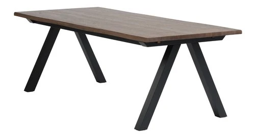 En MDF placage chêne, panneau de particules. Pieds : bouleau massif, pin massif. Excl. rallonges. Vernis, teinté. l100 x L210 x H75 cm