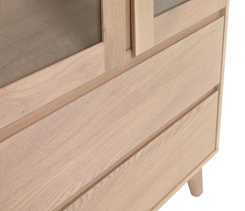 Face avant, partie supérieure et inférieure, côtés : placage chêne, panneau de particules. Étagère : verre trempé. Pieds : chêne massif. Vernis. 2 portes soft-close, 2 tiroirs soft-close avec glissières d’extension complète. l80 x H180 x P40 cm
