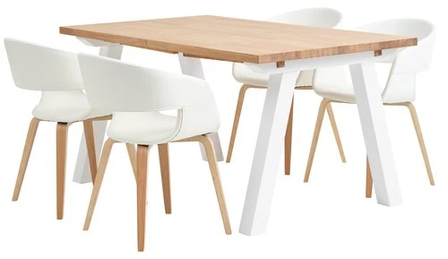 Table : cadre, plateau : placage chêne, chêne massif. Piètement : MDF, bouleau massif, pin massif. Huilé. Excl. rallonges. l90 x L150 x H75 cm. Chaise : structure : contreplaqué. Garnissage : mousse polyuréthane. Revêtement : laine et polyester. Piètement : contreplaqué plaqué chêne. Vernis. l50 x H77 x P53 cm